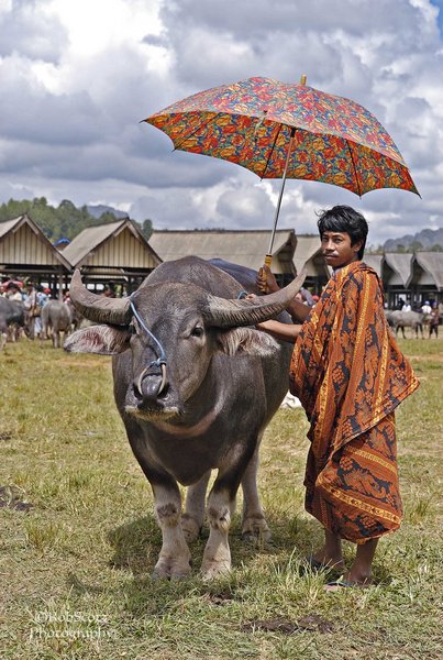 Protecting valuable buffalo (for sacrificial festivals) from the midday sun in the livestock market in Rantepao, Tana Toraja, Sulawesi.