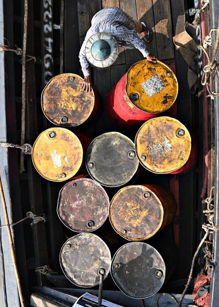 Preparing ice for the fishing fleet, Gulf of Tonkin, Vietnam